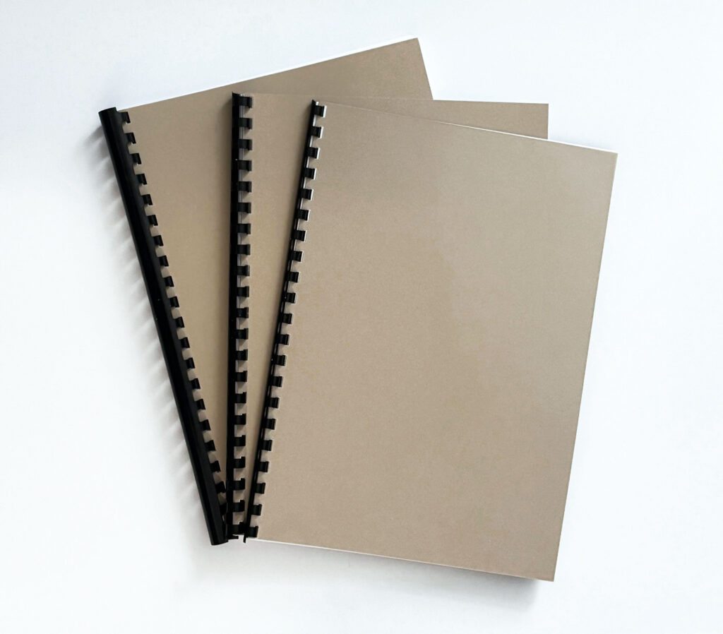- Spiralbindung in Metall (metallfarbig, weiss und schwarz) und Kunststoff (schwarz), mit Deckfolie und Binderücken erhältlich